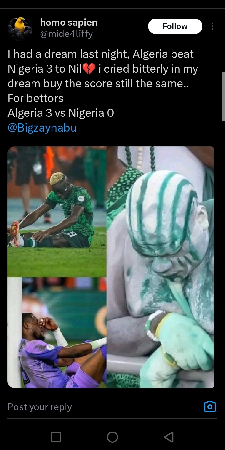 The lady with X handle, @mide4liffy shared that she wept over her dream about Super Eagles match with Algeria.