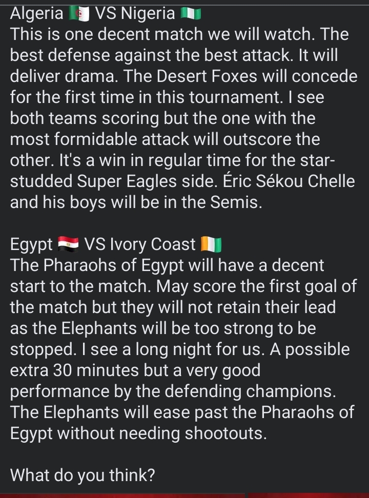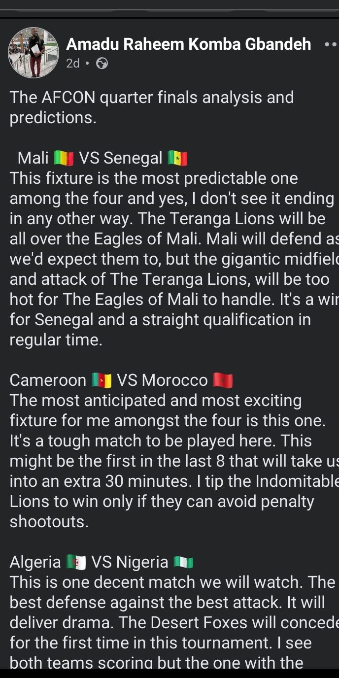 About other AFCON fixtures, he predicted that Senegal will defeat Mali, Cameroon will defeat Morocco, and Ivory Coast will defeat Egypt.