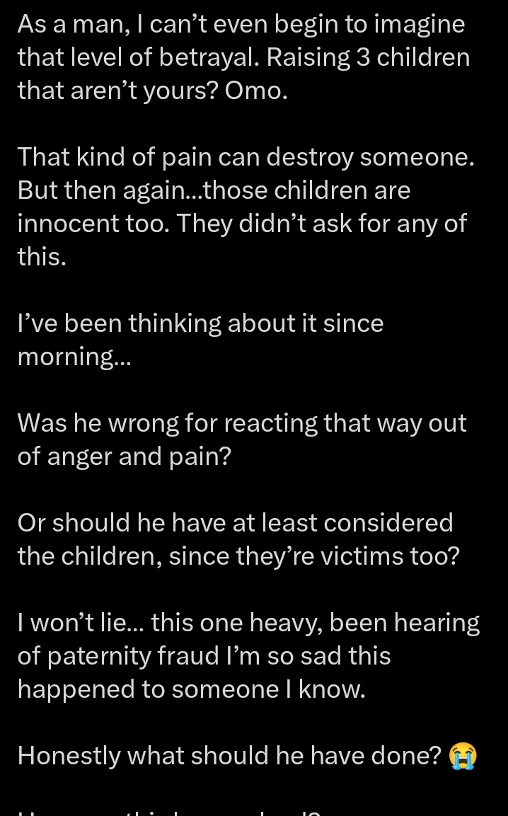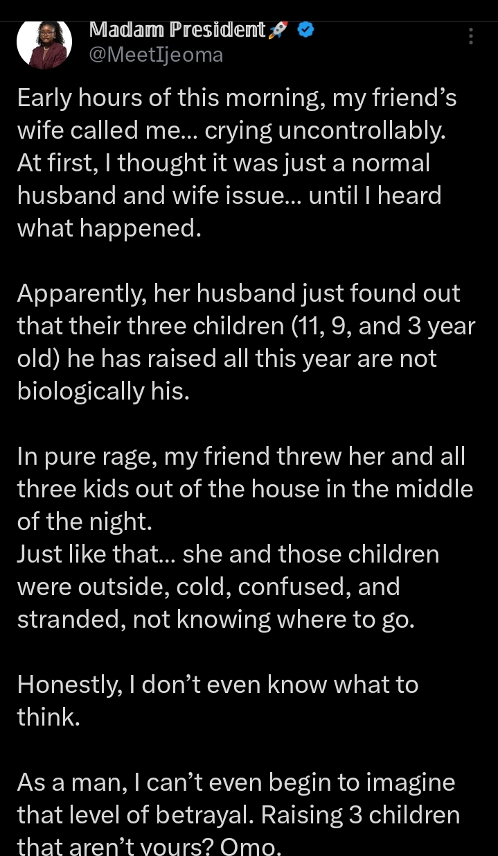 Sharing insights about the heartbreaking incident, @MeetIjeoma revealed that her friend discovered his three children, aged 11, 9, and 3, were not his.