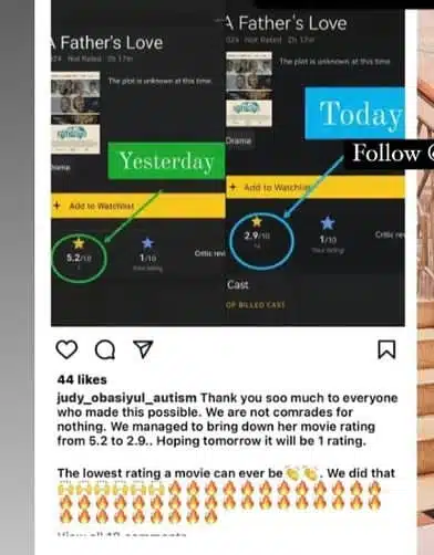 A screen grab demonstrated the dramatic drop in the movie’s rating from 5.2 to 2.9 in a single day.