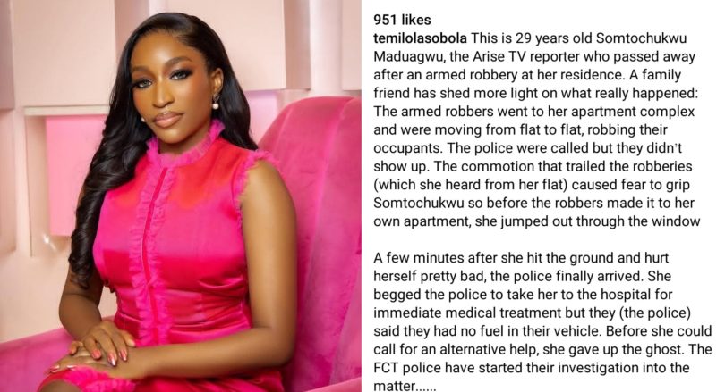 Temilola Sobola wrote: “This is 29 years old Somtochukwu Maduagwu, the Arise TV reporter who passed away after an armed robbery at her residence.