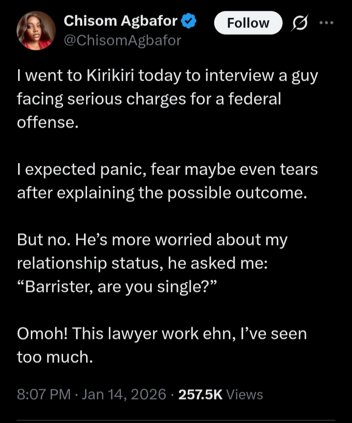 A Nigerian lawyer, @ChisomAgbafor, has stirred reactions online after recounting an unexpected encounter during a visit to Kirikiri Correctional Centre, Lagos.