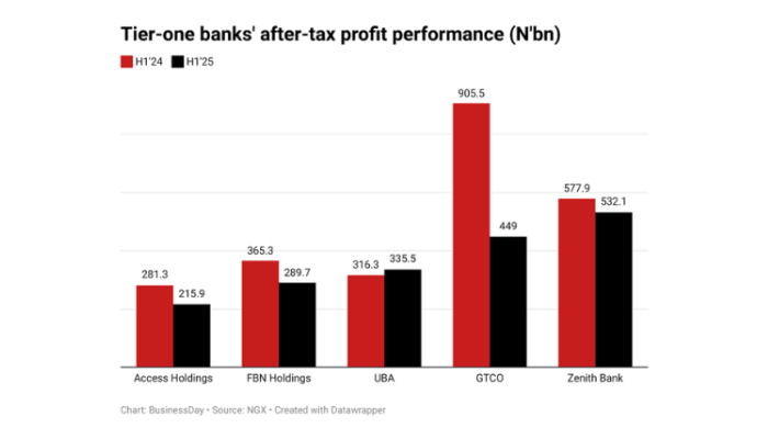 Nigeria’s tier 1 banks, including First Bank of Nigeria Holding, United Bank for Africa, Guaranty Holding Company, Access Holdings, and Zenith Bank, posted a combined profit after tax of N2.91 trillion for the first nine months of 2025, compared to N3.42 trillion in the same period last year.