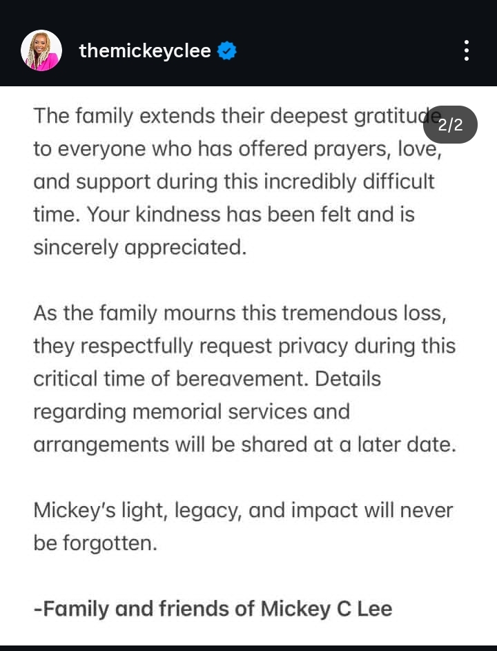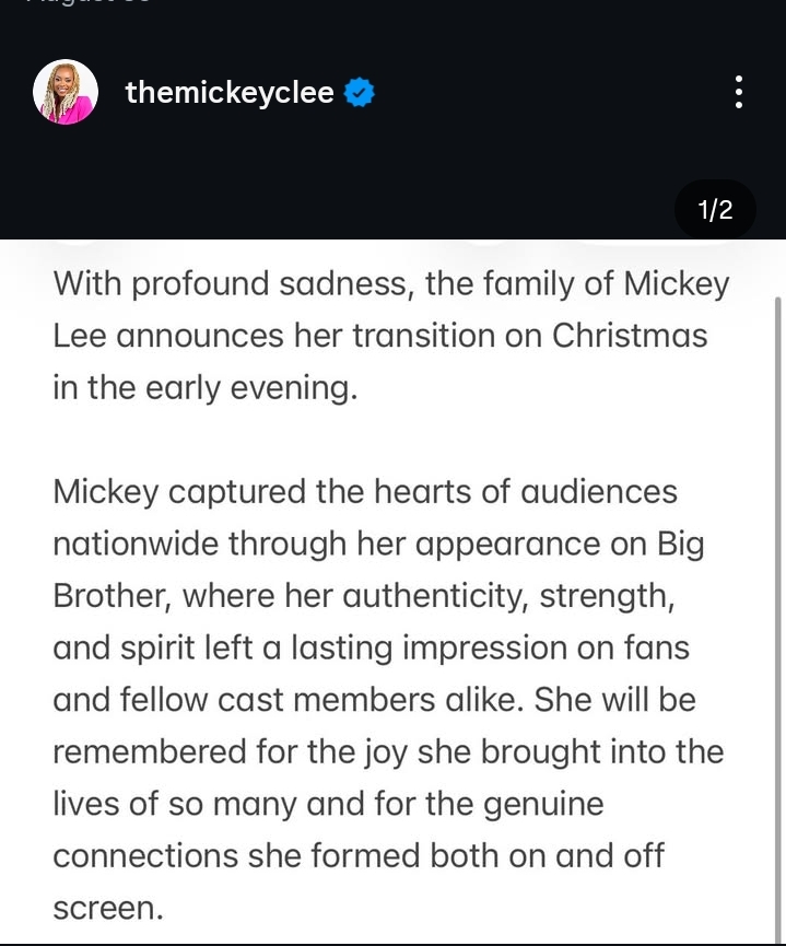 According to the statement released, Mickey Lee passed away on Christmas evening, but the circumstances surrounding her passing weren’t disclosed.