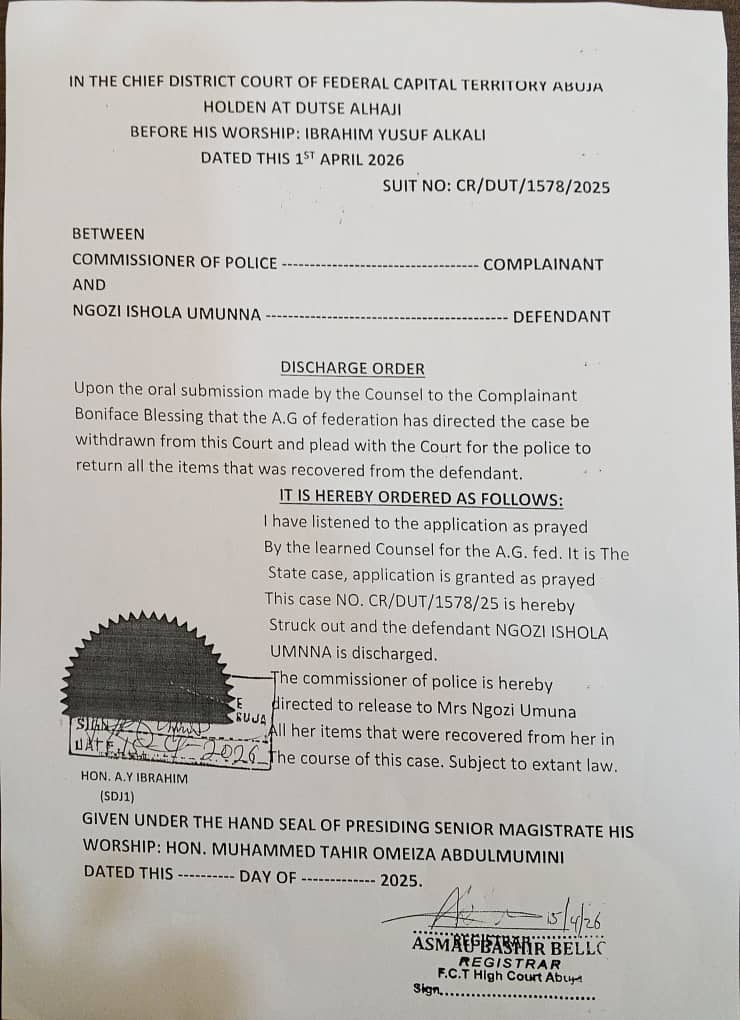 “This case NO. CR/DUT/1578/25 is hereby struck out and the defendant Ngozi Ishola Umunna is discharged,” the court added.