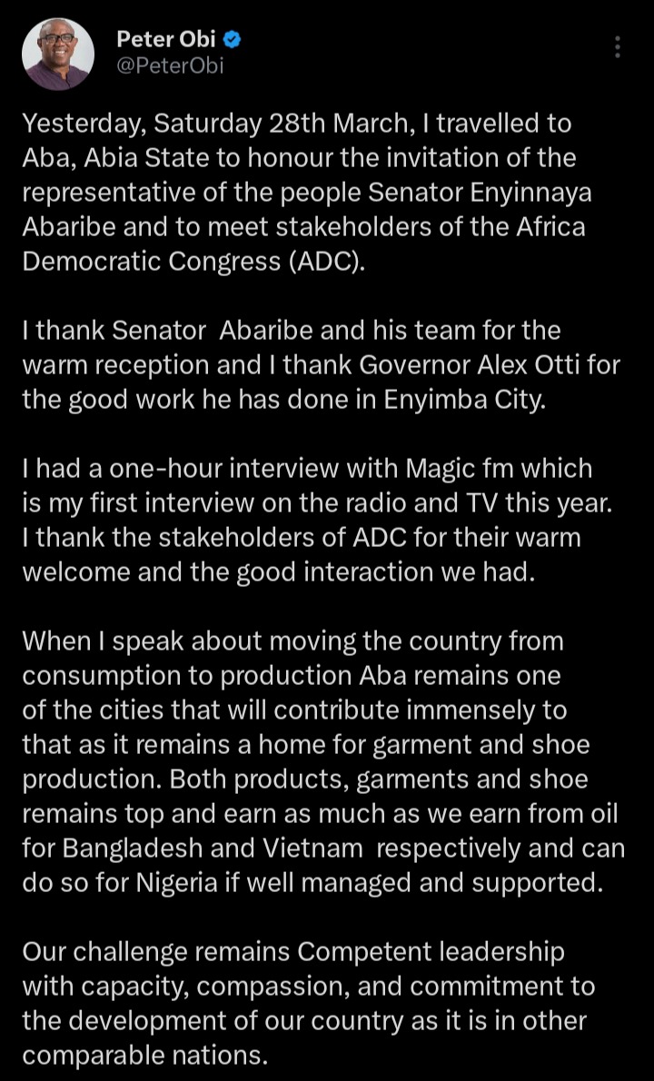 According to the statements which were shared on his official X handle, the former Anambra governor disclosed that he was in the state to honor the invitation of respected federal lawmaker, Senator Enyinnaya Abaribe.