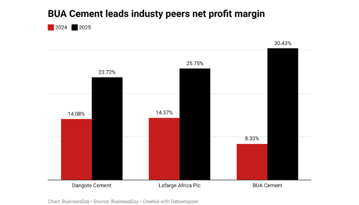 BUA Cement Plc, the second-largest cement manufacturer in Nigeria, outperformed industry peers to become the most profitable cement maker by net profit margin in 2025.