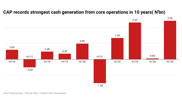 By emphasising local production and efficient sourcing of raw materials, CAP has managed to keep its cost of sales in check. The company’s cost of sales rose 13 percent to N11.37 billion, much lower than its 29 percent revenue growth, indicating improved cost efficiency and better pricing power. As a result, gross profit surged 57 percent to N8.72 billion from N5.56 billion in H1 2024.