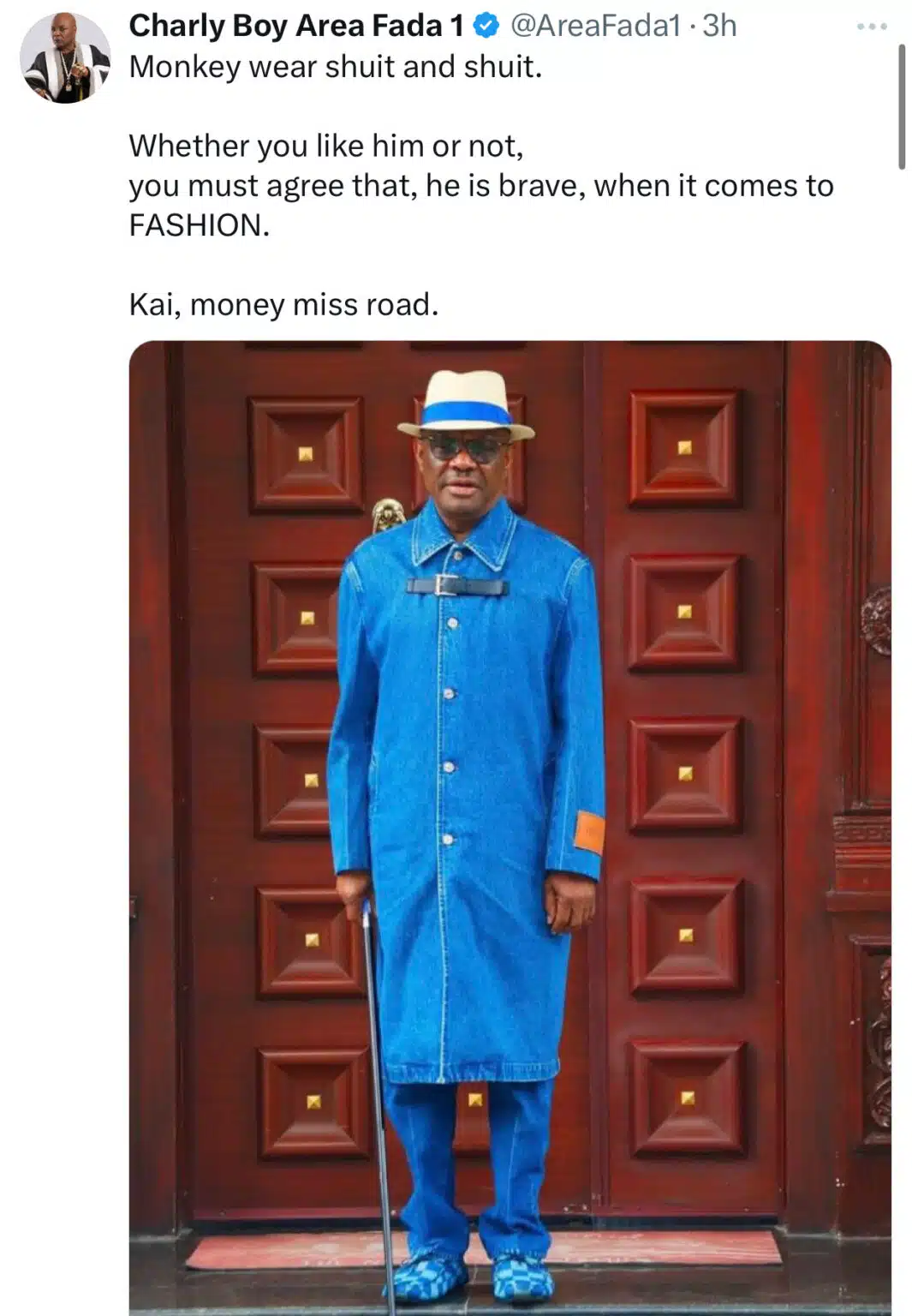 Charly Boy reacted by applauding Wike’s fashion style. He did, however, remark that his outfit exudes grandeur.