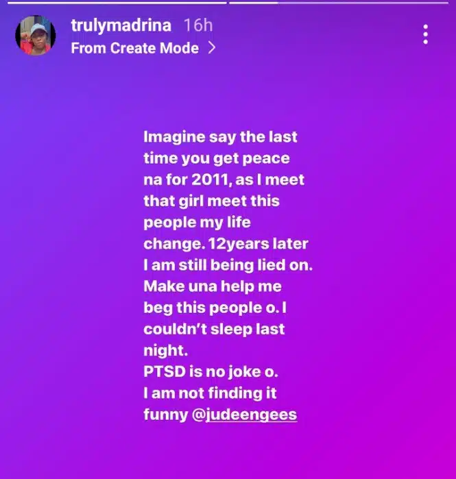 “Imagine say the last time you get peace na for 2011, as I meet that girl meet this people my life change. 12years later I am still being lied on. Make una help me beg this people o.I couldn’t sleep last night. PTSD is no joke o. I am not finding it funny @judeengees”