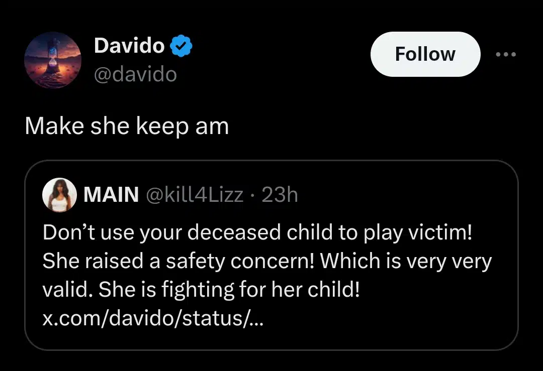 He also tweeted, “All I asked for was ‘joint custody’ but cus it’s davido yall wanna act like yall can’t read! SMH I’m off this … yall be blessed and I pray this never happens to you.”
