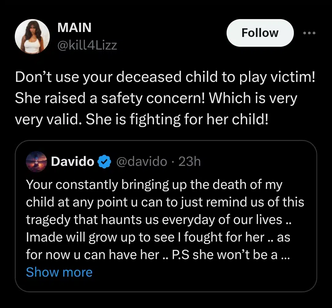 When a user, #kill4Lizz, commented, “Don’t use your deceased child to play victim! She raised a safety concern! Which is very very valid. She is fighting for her child!”