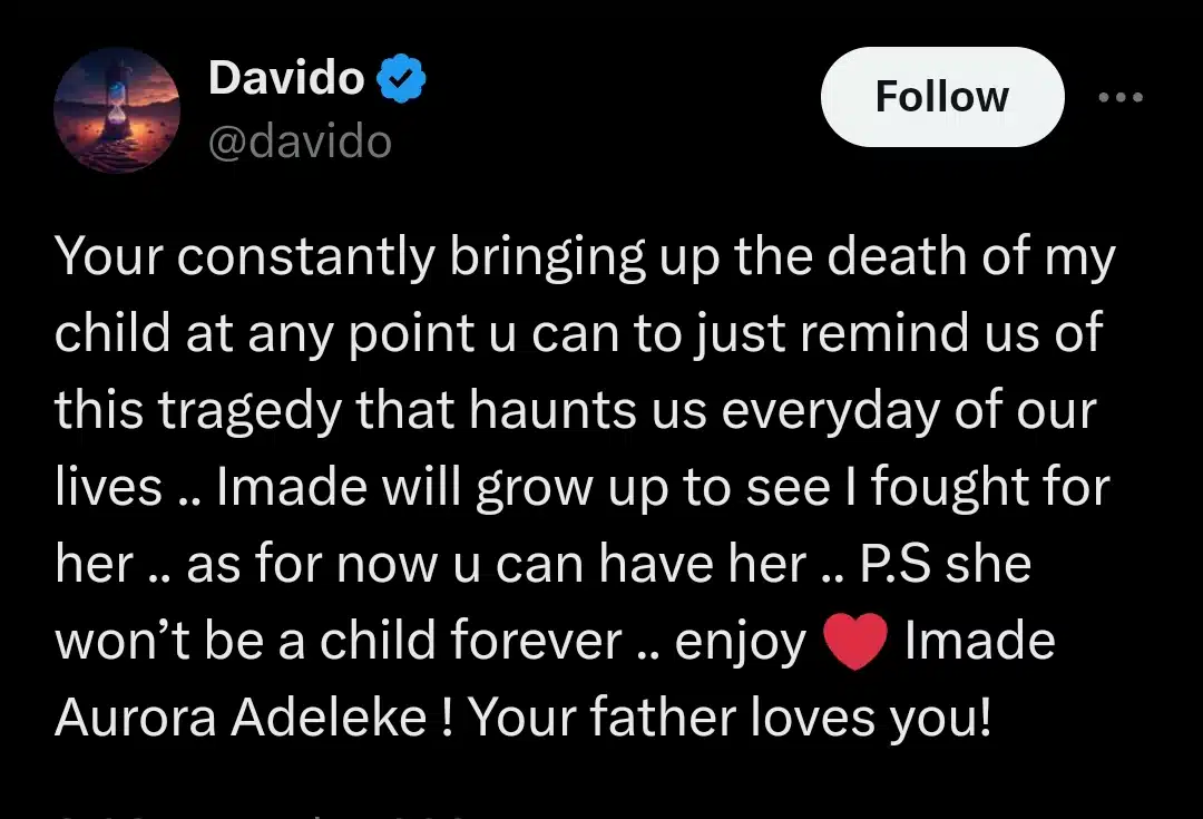 He accuses Momodu of using the death of his son to manipulate the situation and gain custody of Imade, tweeting, “Your constantly bringing up the death of my child at any point u can to just remind us of this tragedy that haunts us everyday of our lives .. Imade will grow up to see I fought for her .. as for now u can have her .. P.S she won’t be a child forever .. enjoy ❤️ Imade Aurora Adeleke ! Your father loves you!”