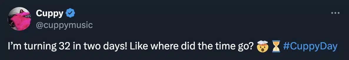 “I’m turning 32 in two days! Like where did the time go? 🤯⏳ #CuppyDay,” she wrote.