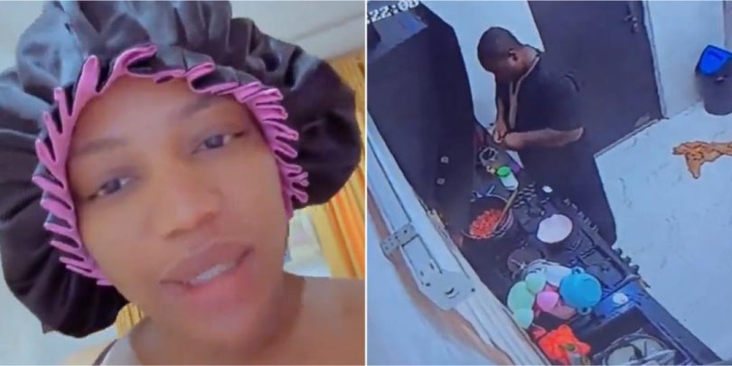 A Nigerian married lady has sparked reactions online after sharing a CCTV video of her husband cooking and ensuring she and their child were well taken care of.
