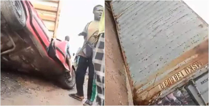 A tragic accident has claimed the life of a commercial driver in Oyo State after a 40-foot container-laden truck overturned and fell on his Nissan Micra taxi.
