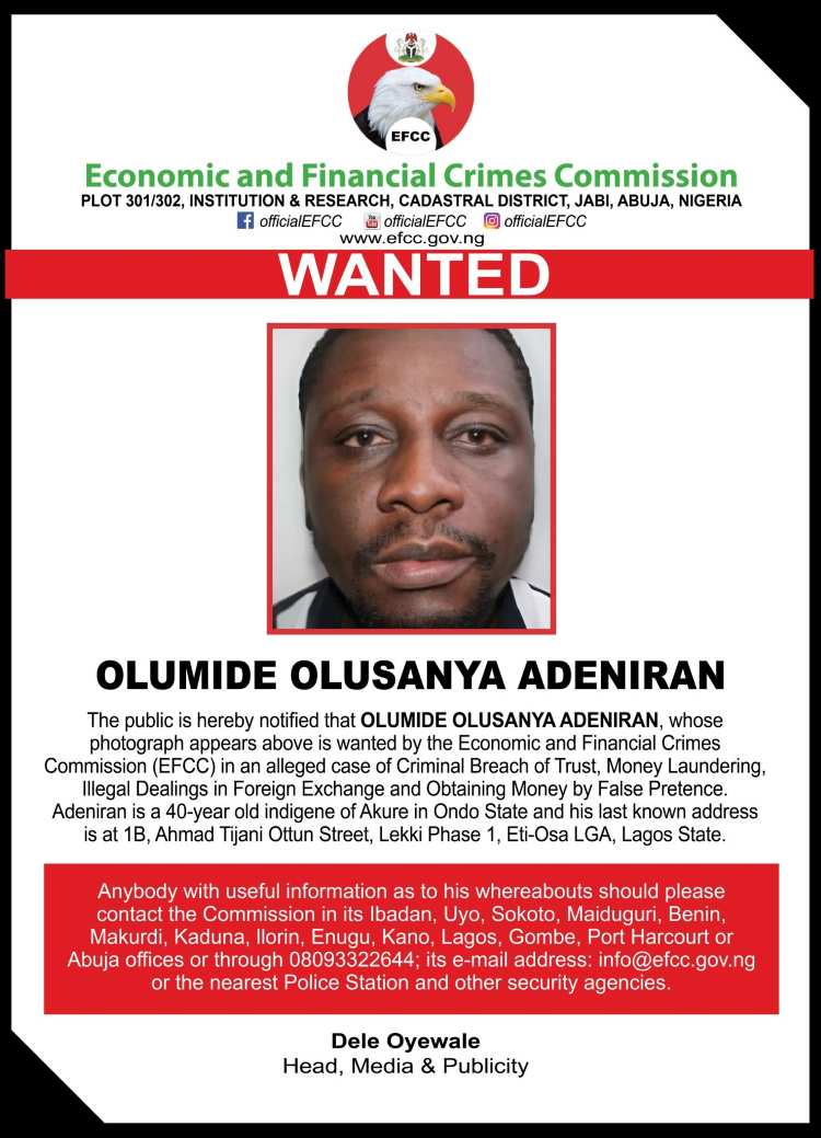 Olumide Olusanya Adeniran, the founder of EazzyTranzact Payment Services and EazzyOil Petroleum Gas Energy Limited, has been declared wanted by the Economic and Financial Crimes Commission (EFCC) over alleged involvement in criminal breach of trust and other unlawful financial transactions.