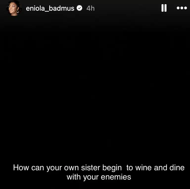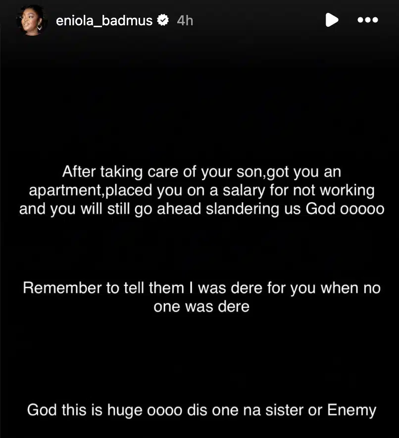 Addressing the speculation, Eniola Badmus took to her Instagram story to explain that her post was about an issue with her sister.
