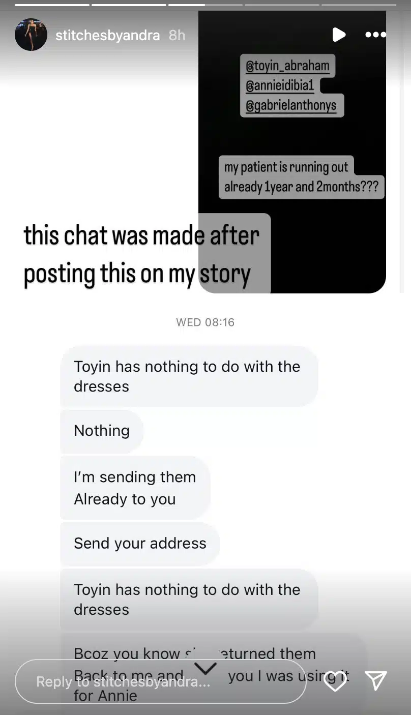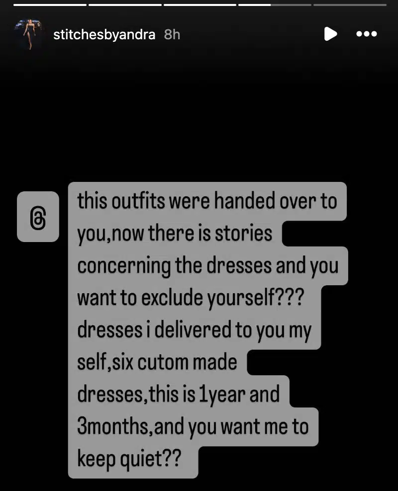 The designer, known as @stitchesbyandra, had taken to her Instagram page to call out the trio, accusing them of failing to settle a debt amounting to millions of naira for one year and two months.