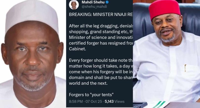 A prominent political commentator, Mahdi Shehu, has reacted to the resignation of the Minister of Innovation, Science and Technology, Chief Uche Geoffrey Nnaji, following allegations of certificate forgery.