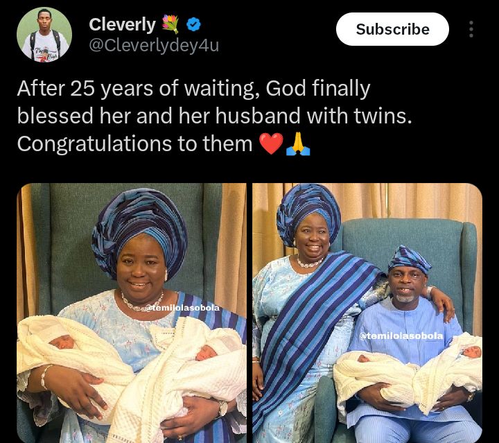 A couple has welcomed twins after 25 years of marriage, ending a long journey marked by patience, prayers and unwavering hope.
