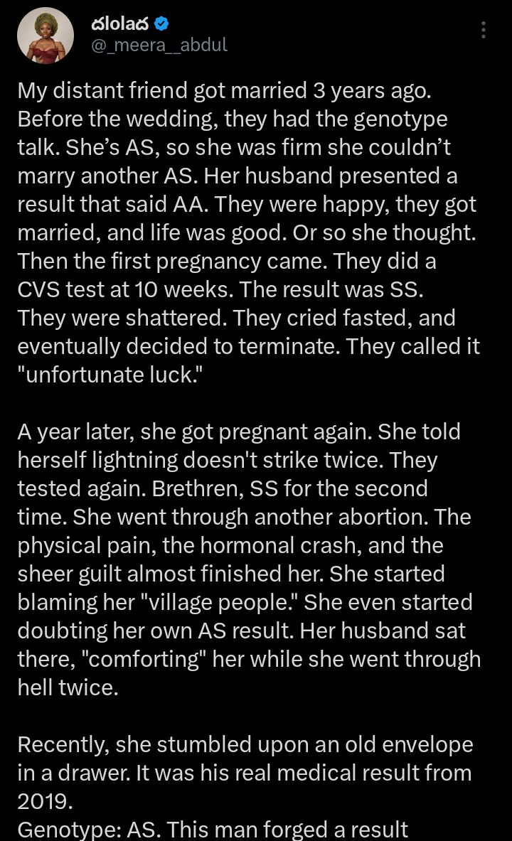 A woman has reportedly confronted her husband after discovering that he allegedly forged his genotype result before their wedding, a deception that led her to undergo two abortions.
