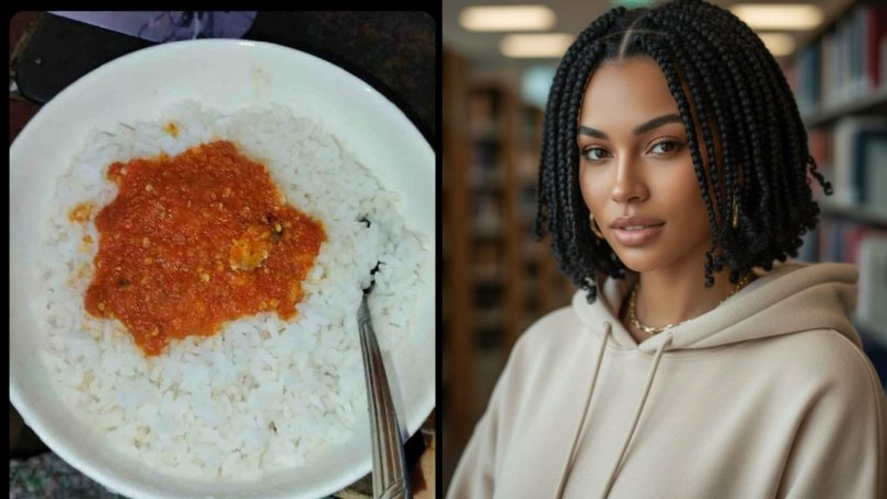 The woman shared a photo of the meal online, showing plain rice with stew poured over it but no visible protein, describing the experience as disappointing and embarrassing.