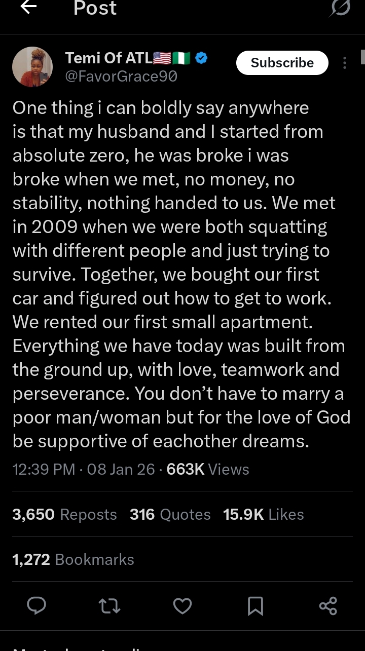 The wife, identified as @FavourGrace09 on X (formerly Twitter), shared that when they met, they were broke and squatting with different people to survive.