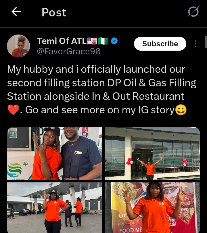 Her tweet also included photos of the filling station, which has been met with congratulatory messages from X users.