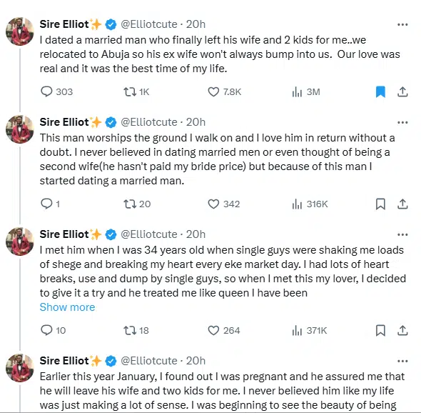 “I dated a married man who finally left his wife and 2 kids for me..we relocated to Abuja so his ex wife won’t always bump into us. Our love was real and it was the best time of my life.