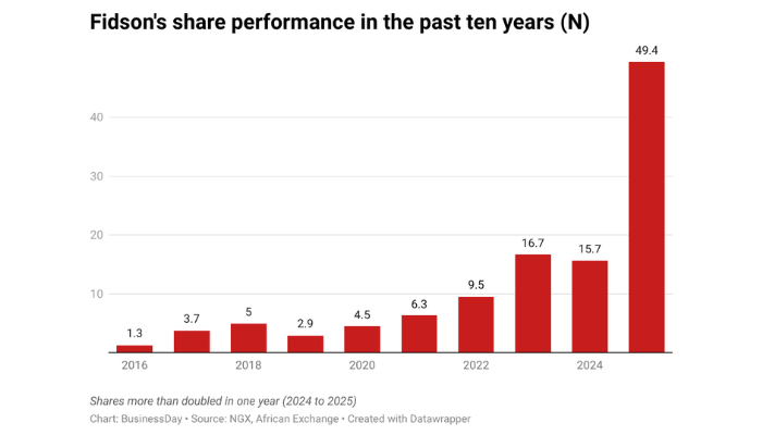 Momentum has been particularly strong in recent weeks. Fidson shares have gained about 83 percent over the past four weeks alone, placing them among the top performers on the exchange. Trading activity has picked up, with 57.5 million shares changing hands over the past three months in nearly 22,000 deals, valued at N2.77 billion. Average daily volume stood at about 912,000 shares, with a high of 8.59 million on Dec. 30.