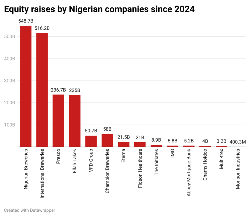International Breweries also approached the market with a sizeable rights issue, seeking to raise N588 billion in 2024. The offer was 87.8 percent subscribed, allowing the company to raise N516.2 billion.