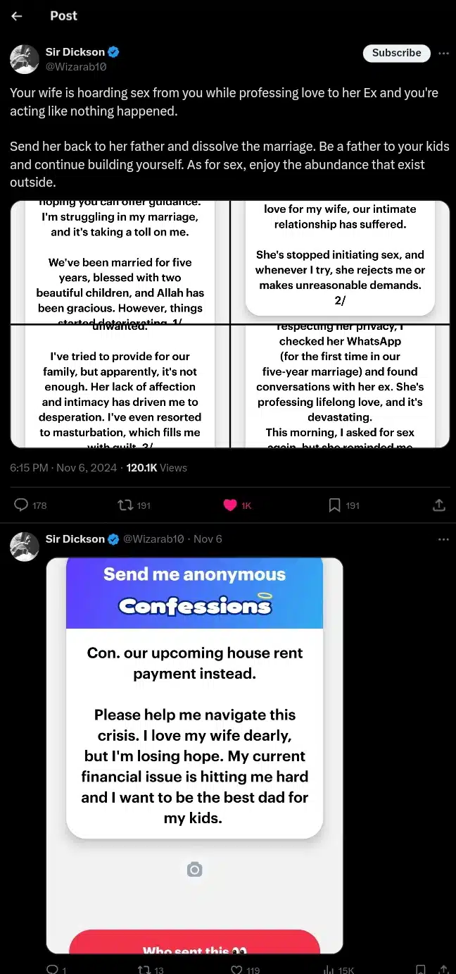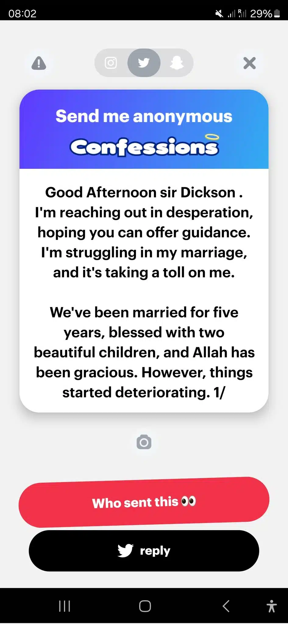 “Good afternoon, sir Dickson. I’m reaching out in desperation, hoping you can offer guidance. I’m struggling in my marriage, and it’s taking a toll on me. We’ve been married for five years, blessed with two beautiful children, and Allah has been gracious.”