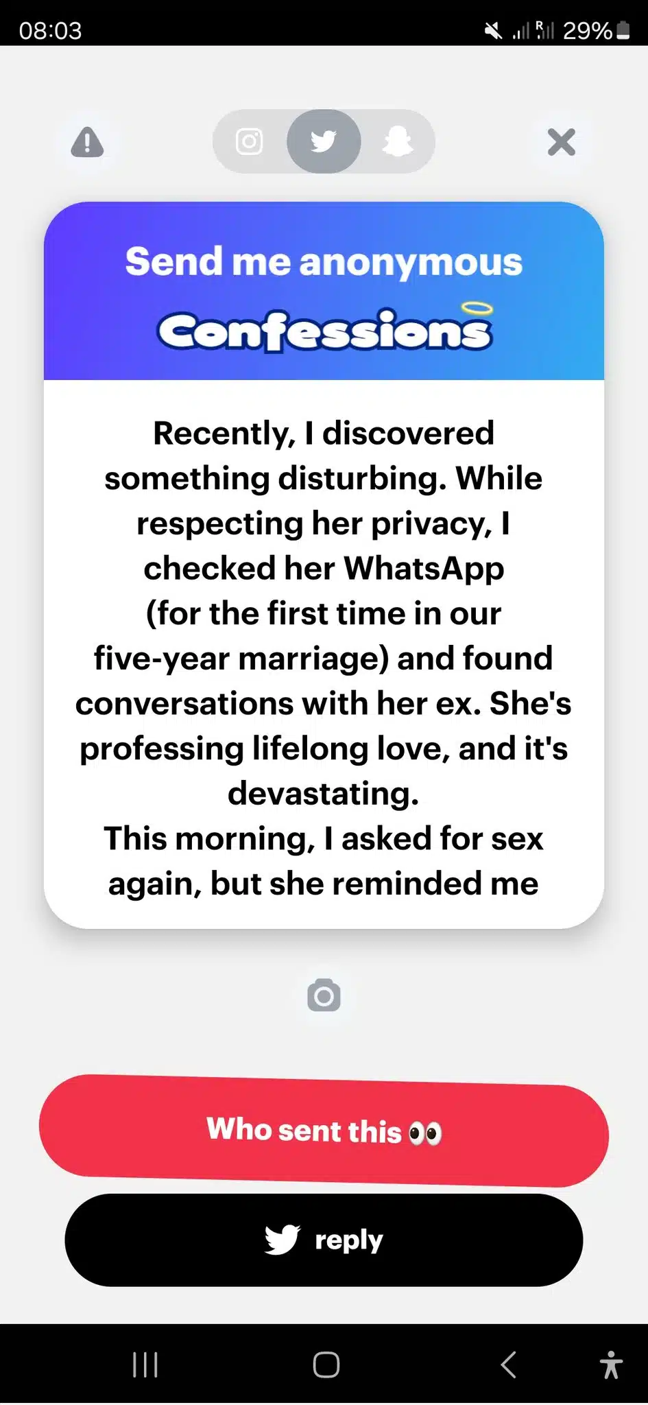 “I’ve tried to provide for our family, but apparently, it’s not enough. Her lack of affection and intimacy has driven me to desperation. I’ve even resorted to masturbation, which fills me with guilt. Recently, I discovered something disturbing. While respecting her privacy, I checked her WhatsApp (for the first time in our five-year marriage) and found conversations with her ex. She’s professing lifelong love, and it’s devastating.”