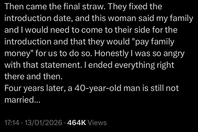 Then came the final straw. They fixed the introduction date, and this woman said my family and I would need to come to their side for the introduction and that they would ‘pay family money’ for us to do so. Honestly I was so angry with that statement. I ended everything right there and then. Four years later, a 40-year-old man is still not married.”