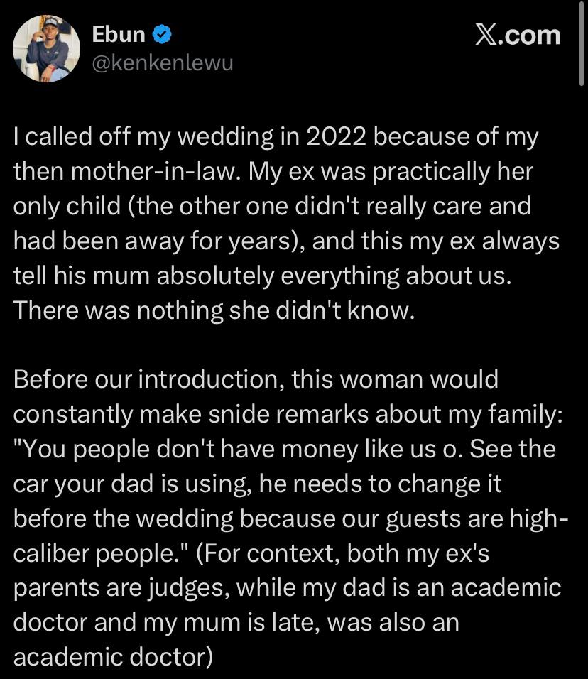 “I called off my wedding in 2022 because of my then mother-in-law. My ex was practically her only child (the other one didn’t really care and had been away for years), and this my ex always tell his mum absolutely everything about us. There was nothing she didn’t know.