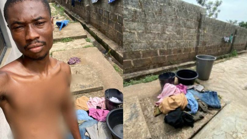 A man has sparked widespread reactions on social media after sharing a candid post expressing his desire for a relationship, accompanied by photos of him doing laundry in what appears to be his compound.