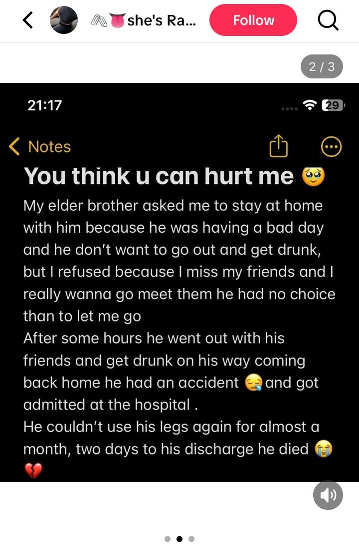 You think you’re can hurt me? My elder brother asked me to stay at home with him because he was having a bad day and he don’t want to go out and get drunk, but I refused because I miss my friends and I really wanna go meet them he had no choice than to let me go.