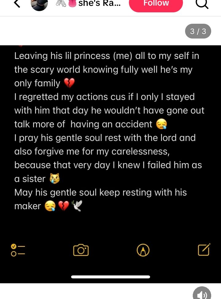 I regretted my actions cus if I only I stayed with him that day he wouldn’t have gone out talk more of having an accident. I pray his gentle soul rest with the lord and also forgive me for my carelessness, because that very day I knew I failed him as a sister.