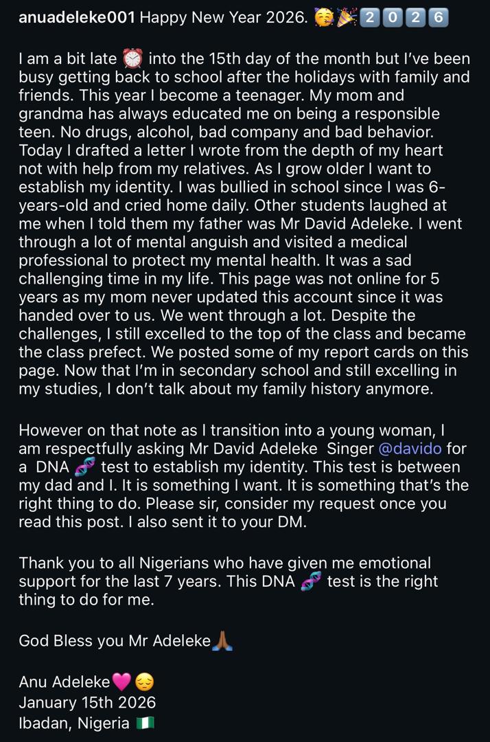 Anu Adeleke, the young woman whose mother has long claimed she was fathered by Afrobeat singer Davido, has gone public to request a DNA test to confirm her paternity.
