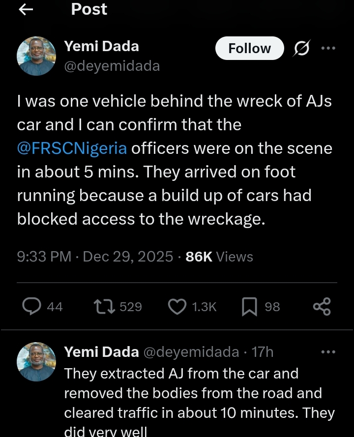 I was one vehicle behind the wreck of AJs car and I can confirm that the @FRSCNigeria officers were on the scene in about 5 mins. They arrived on foot running because a build up of cars had blocked access to the wreckage.