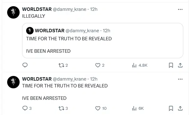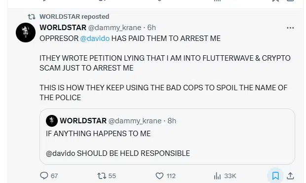 In a Tweet he made on his X page, Dammy Krane alleged that he had been arrested illegally by police allegedly on Davido’s instructions.