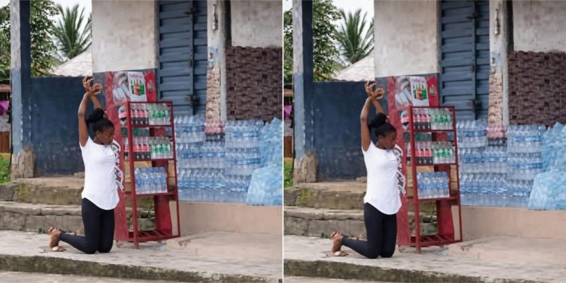 On getting there, you meet her kneeling down like this. You’re confused, so you ask her why she’s on her knees, and she tells you her boss instructed her to do so as a punishment.