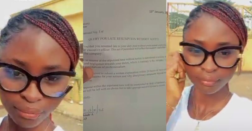 According to the letter, the query stemmed from the female corper resuming late, without prior notification.