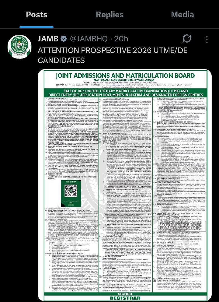 The announcement was made in a statement signed by the Registrar, Prof. Ishaq Oloyede, and shared on the Board’s official X handle on Tuesday night.
