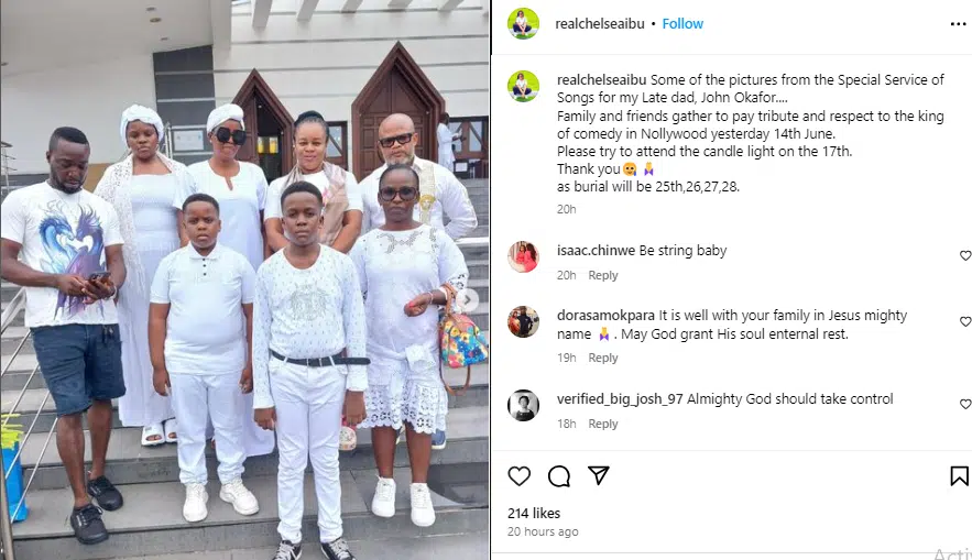 Mr Ibu’s biological daughter, Chelsea Okafor announced on her Instagram page that a service of songs was recently held in memory of their father.