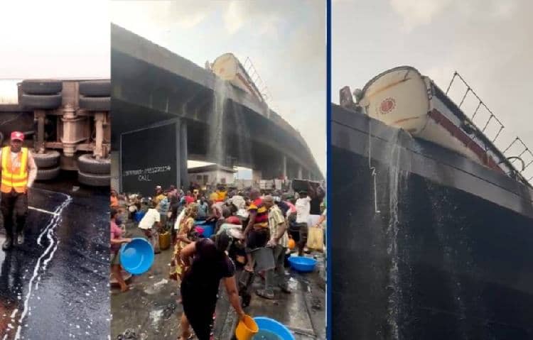 Footage shared by Channels Television showed residents gathering beneath the bridge to scoop diesel from the fallen tanker.