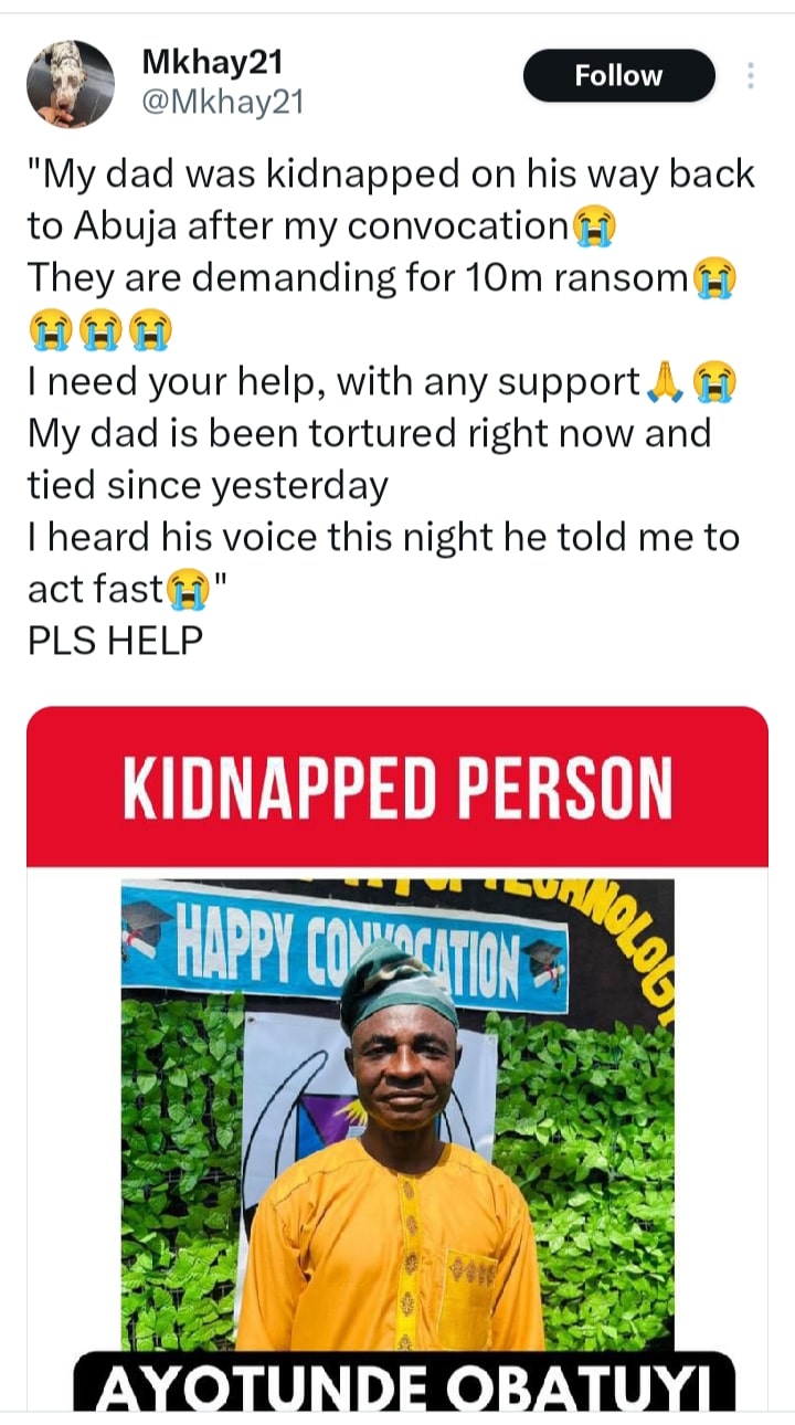 A young graduate has shared a desperate plea for help after her father was reportedly kidnapped while returning to Abuja following her convocation.
