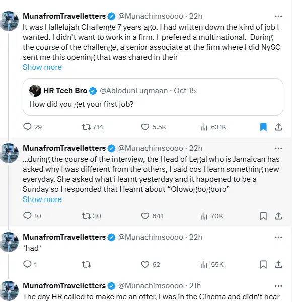 The lady known as @Munachimsoooo on X shared her testimony in response to a tweet asking people how they secured their first job.