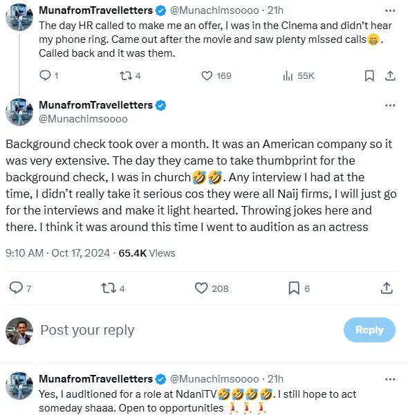 Background check took over a month. It was an American company so it was very extensive. The day they came to take thumbprint for the background check, I was in church🤣🤣. Any interview I had at the time, I didn’t really take it serious cos they were all Naij firms, I will just go for the interviews and make it light hearted. Throwing jokes here and there. I think it was around this time I went to audition as an actress.